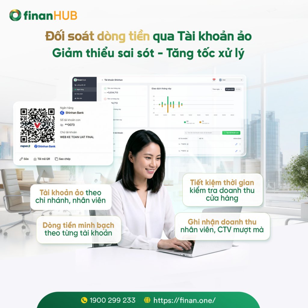finanHUB tích hợp hệ thống Tài khoản ảo (Virtual Account) cho từng chi nhánh hoặc từng giao dịch, giúp tự động hóa hoàn toàn quá trình đối soát. Khi khách hàng chuyển khoản, hệ thống sẽ tự động nhận diện và ghi nhận doanh thu tương ứng với mã định danh. Điều này giúp loại bỏ phụ thuộc vào nội dung chuyển khoản, giảm thiểu sai sót và tiết kiệm đáng kể thời gian xử lý cho bộ phận kế toán.